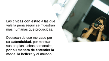 Internet nos hace ver todo el mercado de posibles opciones disponibles. Las chicas con estilo a las que vale la pena seguir se muestran más humanas que producidas. Saltan de ese mercado por su autenticidad. No la autenticidad como ganas de ser la más auténtica, sino autenticidad para mostrar sus propias luchas personales, su manera de entender la moda, la belleza y el mundo.