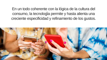 En un todo coherente con la lógica de la cultura del consumo, la tecnología permite y hasta alienta una creciente especificidad y refinamiento de los gustos. A diferencia de las necesidades, que son fijas, el refinamiento es inestable, ya que hasta el mayor gourmet siempre puede ser superado. Todos quieren ir a más: tener más estilo, ser más trendy, tener más seguidores…. Siempre a más.